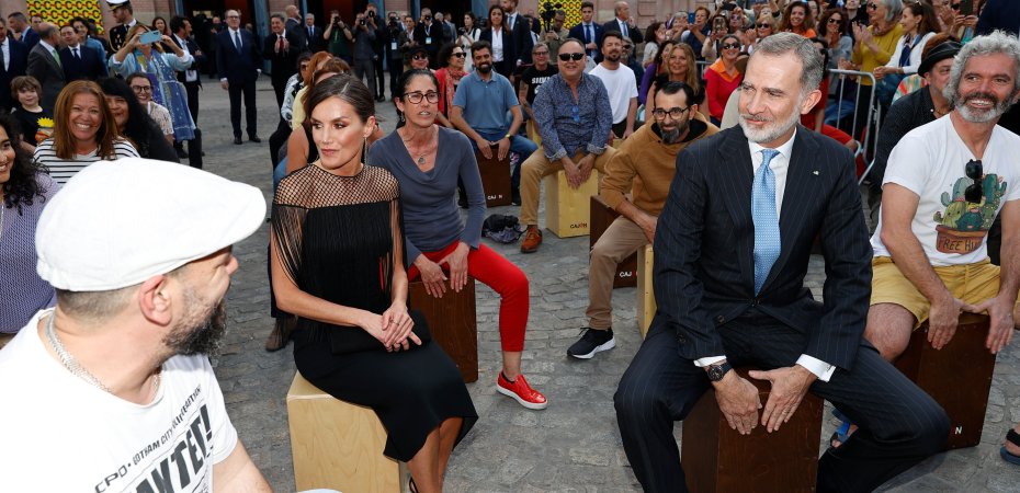 No hay duda de que al rey y a la reina les sienta muy bien Cádiz. Alegría y cariño es lo que demostraron a los gaditanos en la plaza del Gran Teatro Falla, con una cajoneada popular que sorprendió en el momento en el que el rey decidió que él era un rey que también quería tocar los cajones y así lo hizo.