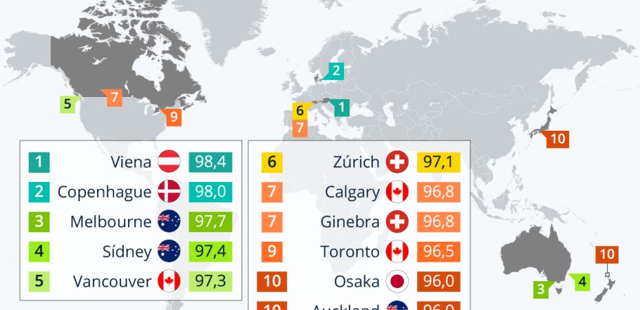 En el top 10 —donde dos urbes comparten el puesto número 7 y otras dos el 10— Canadá es el país mejor representado, con tres metrópolis (Vancouver, Calgary y Toronto), mientras que Australia y Suiza también obtienen buenos resultados, con dos ciudades cada uno.