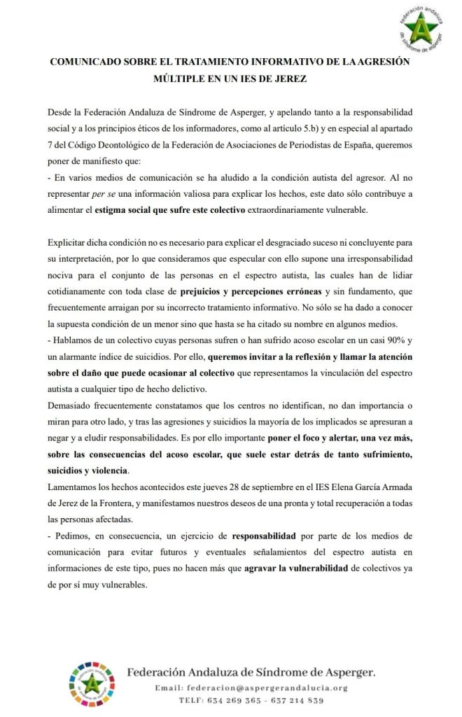 El temor se ha instalado en el colectivo de padres con hijos que sufren autismo de que pueda ser identificados con actitudes violentas por lo que desde la Federación Andaluza de Síndrome de Asperger y apelando “tanto a la responsabilidad social en los principios éticos de los informadores como el artículo 5 B, y en especial al apartado 7 del código deontológico de la Federación de Asociaciones de la Prensa (FAPE)” se pone de manifiesto que “en varios medios de comunicación se ha aludido la condición autista del agresor, al no representar per se una información valiosa para explicar los hechos este dato solo contribuye a alimentar el estigma social que sufre este colectivo extraordinariamente vulnerable”.