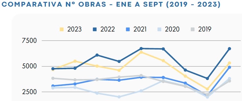 El sector de la construcción en España se ralentiza al reducirse un 13% el volumen de obras ejecutadas en lo que llevamos de año y caer un 11% el presupuesto. En lo que va de ejercicio, se han realizado 36.140 construcciones por valor cercano a los 57.500 millones de euros, lo que supone una caída de 5.429 obras respecto al mismo periodo de 2022.