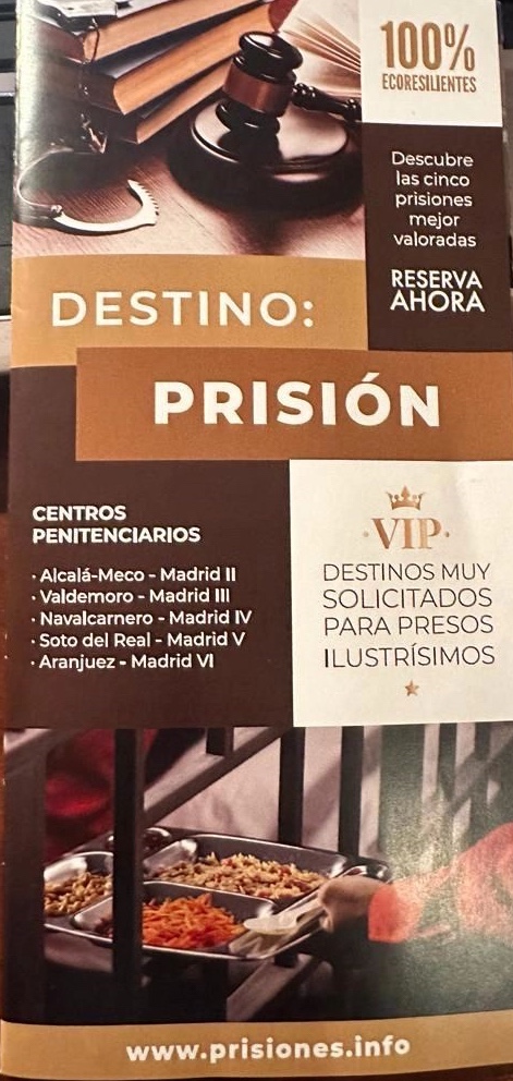 El folleto imita una oferta de una agencia de viajes, con lemas como “ descubre las cinco prisiones mejor valoradas”, “VIP, destinos muy solicitados para presos ilustrísimos”, “Destino prisión”.