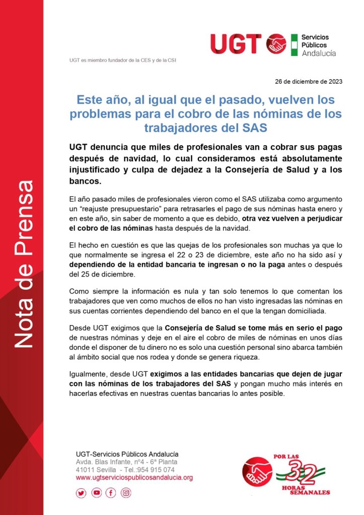 Si bien el pasado año la Consejería de Salud y Consumo indicó que el retraso se debió a un “reajuste presupuestario”, en esta ocasión no hay motivo alguno más allá de la dejadez del SAS pues, como ha podido saber CSIF, las nóminas fueron firmadas el 20 de diciembre, pero la orden de pago no se realizó hasta el viernes 22.