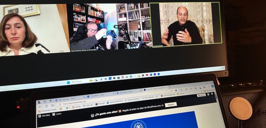 Mustapha Labbassi, Presidente de la Asociación de Periodistas del Norte de Marruecos, director de Med Radio, conversa con los periodistas españoles María Jesús Corrales y Pepe Contreras.