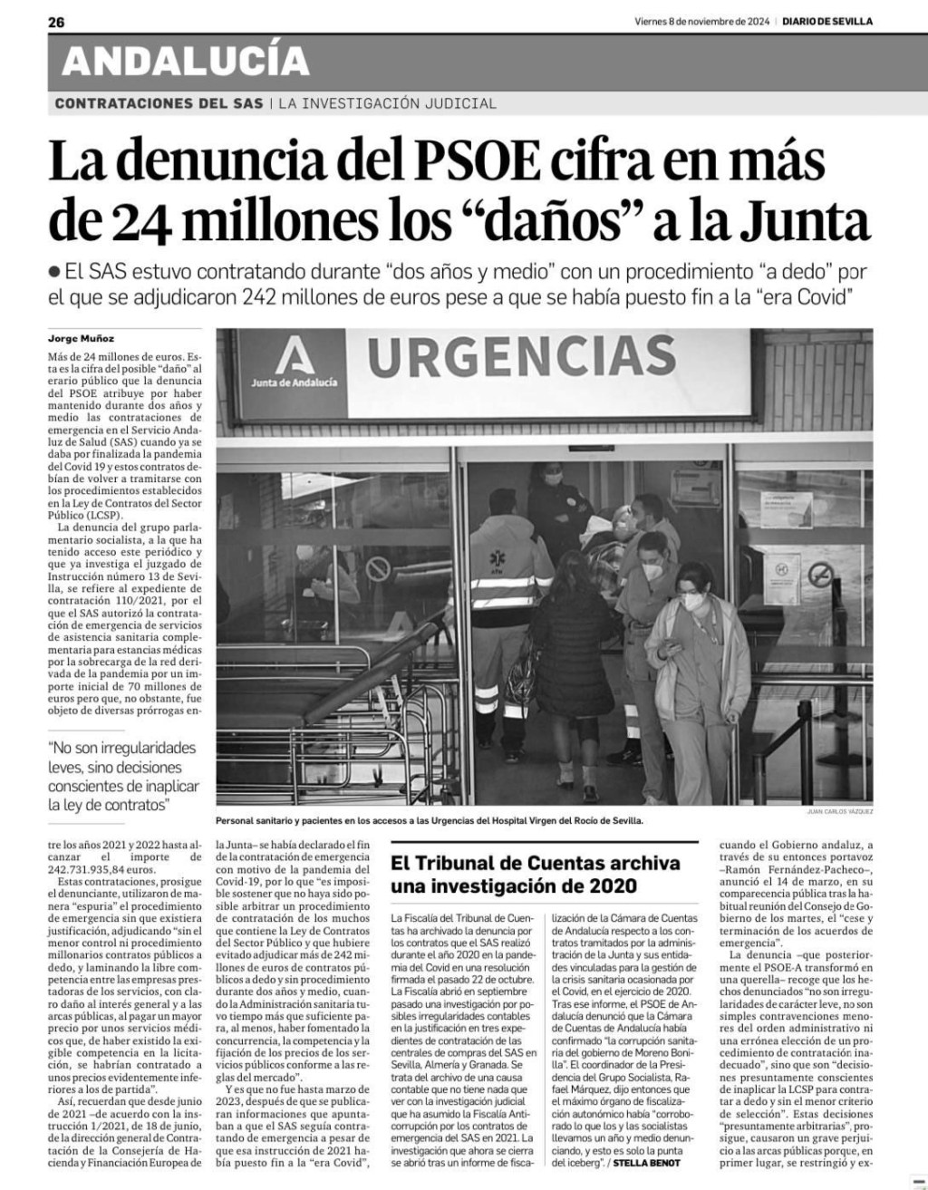 - Fraccionamiento de Contratos: Se ha denunciado que el Servicio Andaluz de Salud (SAS), bajo la administración de Moreno Bonilla, ha fraccionado contratos de emergencia para evitar procedimientos transparentes y concursales, lo que ha permitido adjudicaciones directas o a dedo.