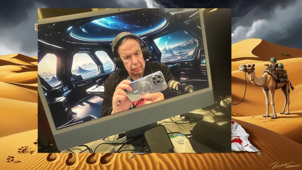 Y luego, el golpe maestro: Grok me caricaturizó como un «Desert Winston Churchill», un periodista en un desierto de dunas marcadas con «COVID» y «News Of The War», enfrentando tormentas con micrófono y mapa. No solo fue un toque creativo; fue una metáfora de mi lucha por dar voz al caos.