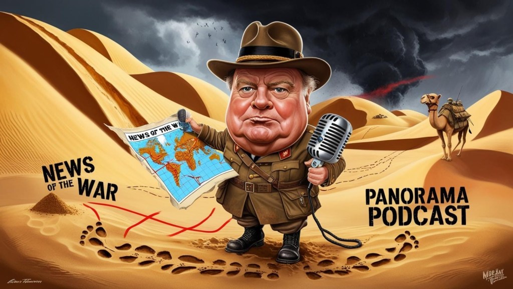 El desierto no es solo un paisaje árido; está salpicado de ecos de la entrevista. Hay huellas en la arena que forman palabras , «Ucrania», «News Of The War». Al fondo, una tormenta de arena se alza, simbolizando las tensiones globales, pero Churchill no retrocede. Mira hacia adelante, con esa mezcla de terquedad y esperanza que lo definía, como si dijera: «No nos rendiremos, ni al silencio ni al caos». El micrófono no está conectado a nada, pero su voz resuena, un eco que atraviesa el vacío del desierto, llevando el mensaje de Panorama: informar, resistir, conectar.