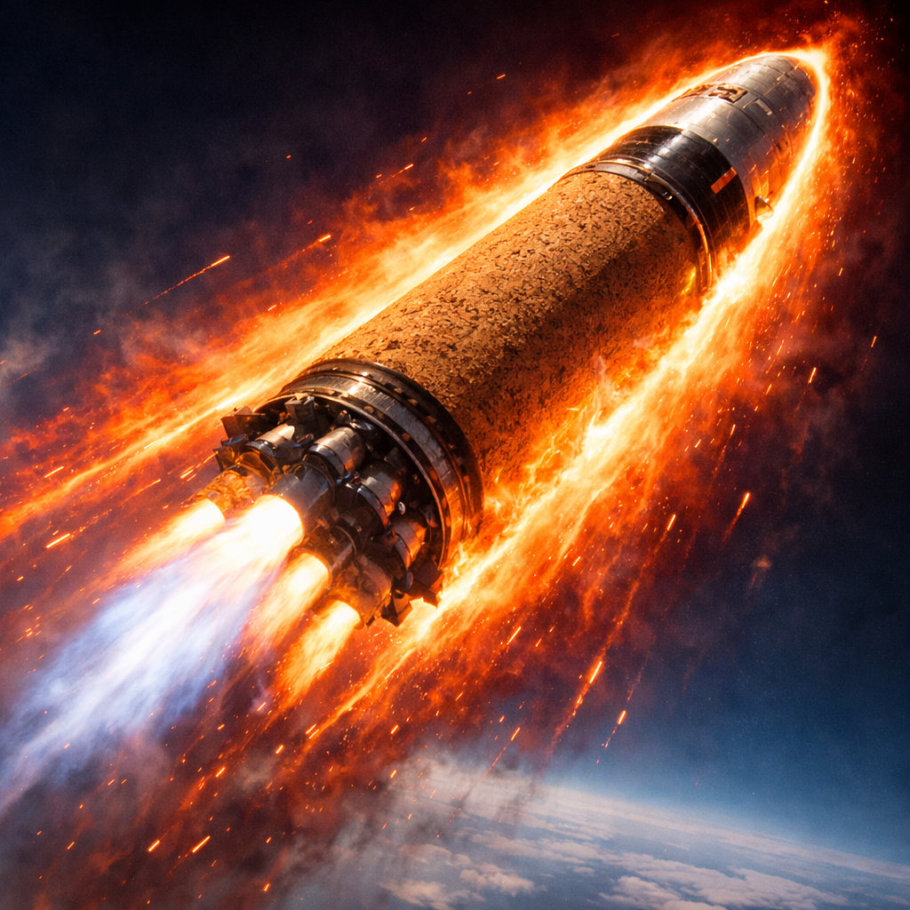 - El truco del «sacrificio»: El corcho tiene una propiedad llamada ablación. En lugar de fundirse o transmitir el calor, se carboniza lentamente. Esa capa de carbón protege el corazón del cohete (sus sensores y su combustible) mientras la corteza se va consumiendo con honor.